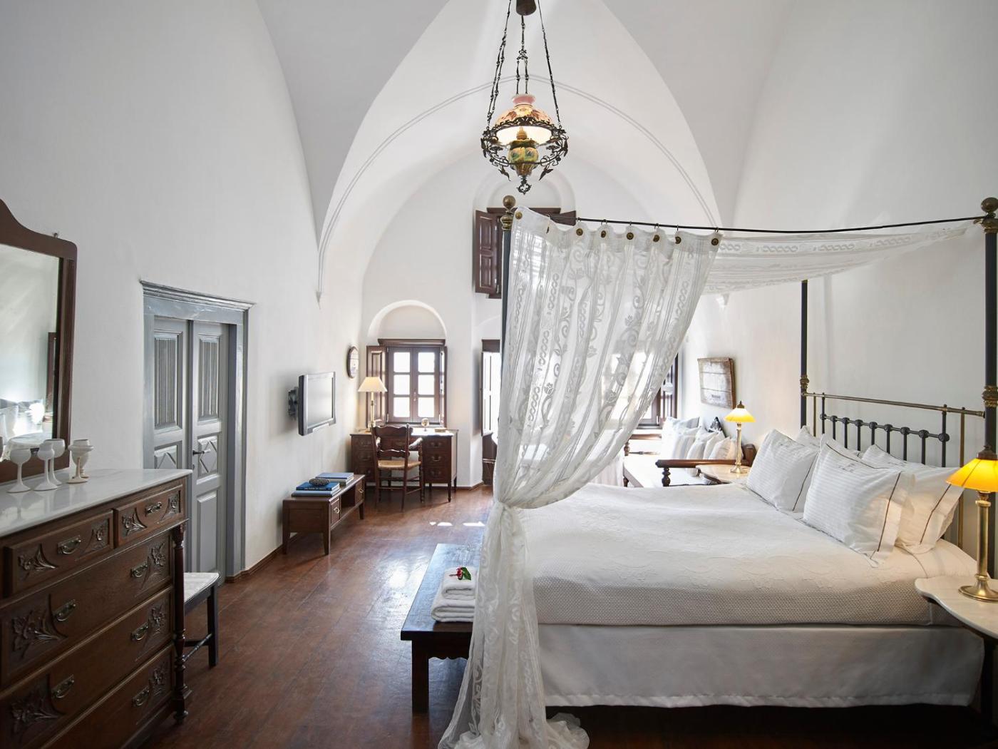 Captains Suite with Caldera View. Fitted with wooden floors and a four-poster bed, this suite combines Santorini’s minimal aesthetics with Renaissance influences. It opens to a shared terrace with unobstructed Caldera views. Facilities include: - free Bulgari toiletries - free WiFi - coffee machine. ;