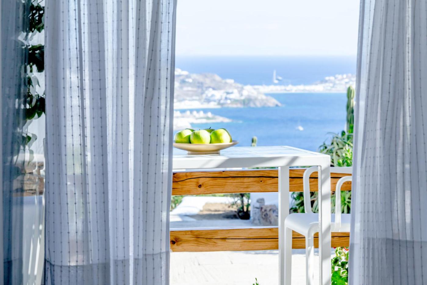 Deluxe One-Bedroom Suite with Garden and Sea View. This apartment offers views over the Aegean Sea and the town of Mykonos from its stone-paved patio. Featuring a kitchenette with fridge, the unit has air conditioning and LCD TV. Free Wi-Fi is provided. ;